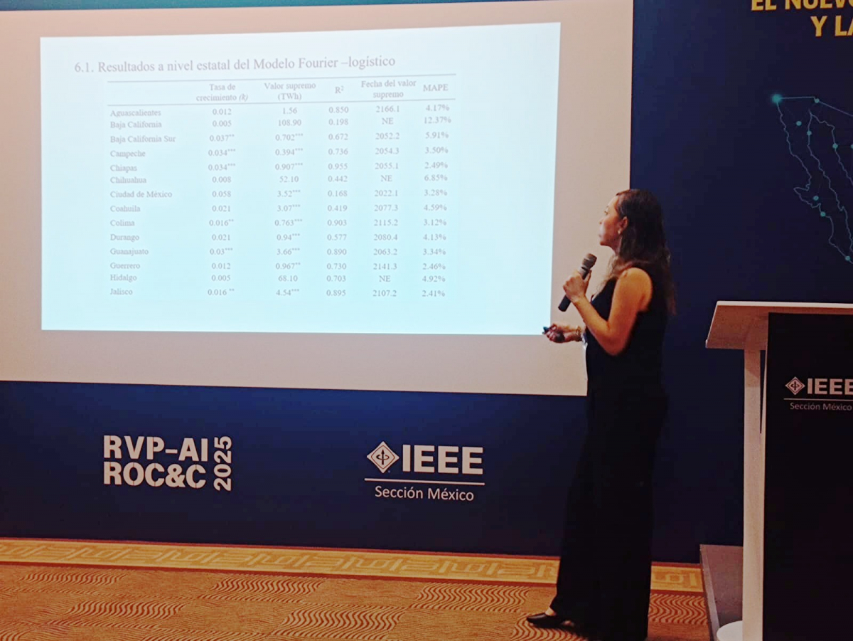 En su ponencia “Modeling the Energy Transition in México: Forecasting under Economic and Climatic Drivers”, la doctora abordó los retos y oportunidades en la transición energética desde una perspectiva científica y prospectiva.Este evento reunió a líderes y especialistas de instituciones como la Secretaría de Energía (SENER), Petróleos Mexicanos (PEMEX), Comisión Federal de Electricidad (CFE) y el Centro Nacional de Control de Energía (CENACE) para dialogar sobre el futuro de los sistemas eléctricos sostenibles, resilientes y eficientes en México.