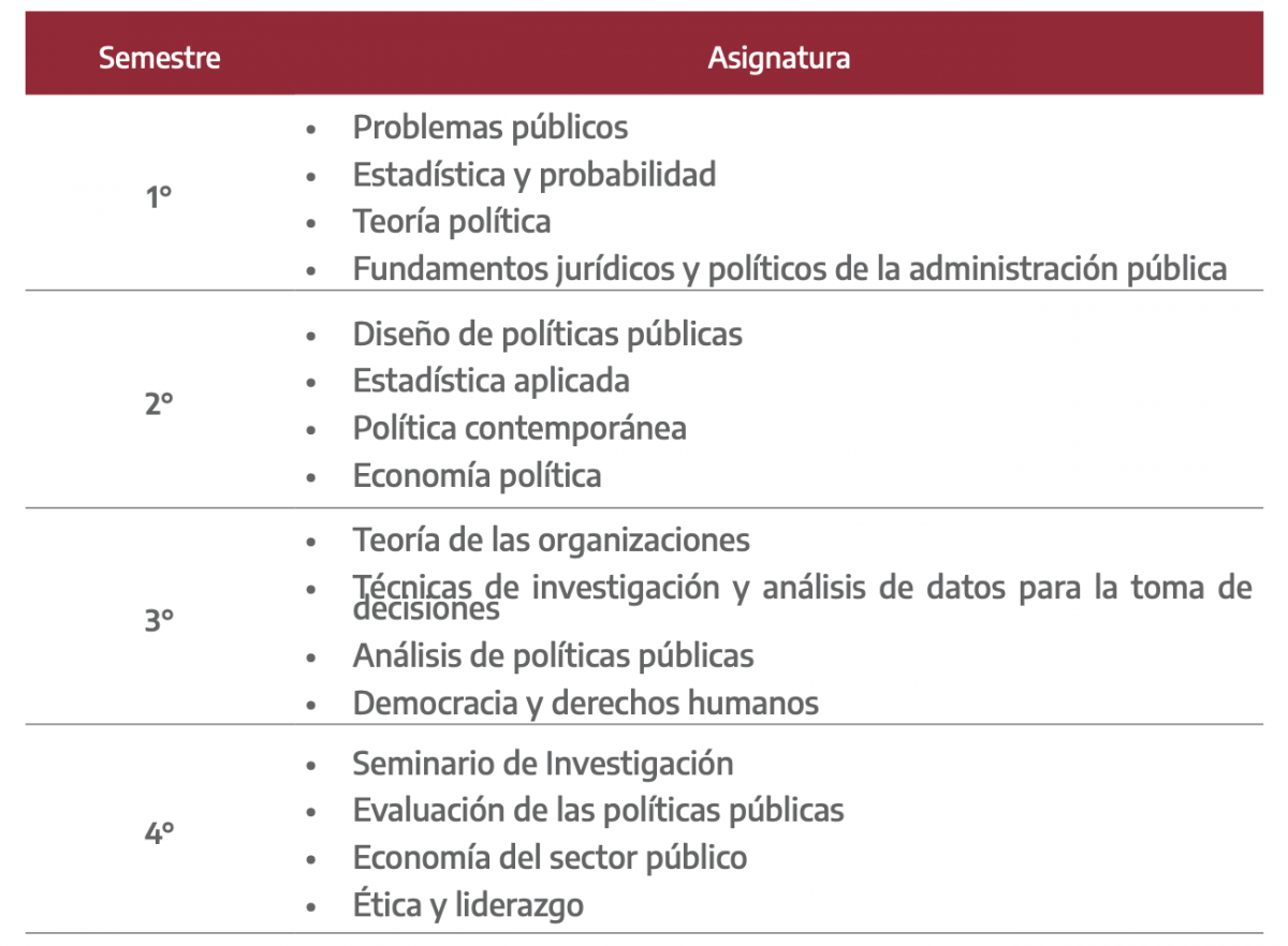El programa de Maestría en Política y Gestión Pública tiene una duración de cuatro semestres integrados por tres asignaturas cada uno, con modalidad presencial. Al término del posgrado el alumno deberá defender ante un sínodo una tesis individual o un proyecto de intervención.